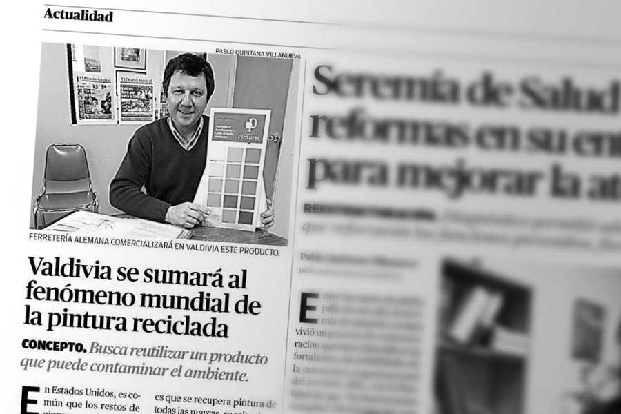 Ferretería Alemana comercializará Pinturec en Valdivia La pintura reciclada llegó a la región de los Ríos. Valdivia se suma al fenómeno mundial de usar pintura reciclada y ser amigables con el medio ambiente. Ver noticia original aquí [su_divider top=”no” divider_color=”#c9c9c9″ size=”1″ margin=”75″] [su_row] [su_column size=”1/2″] [su_button url=”https://pinturec.cl/carta-colores/” target=”blank” style=”flat” background=”#4f9b2a” size=”8″ wide=”yes” center=”yes” radius=”3″ icon=”icon: